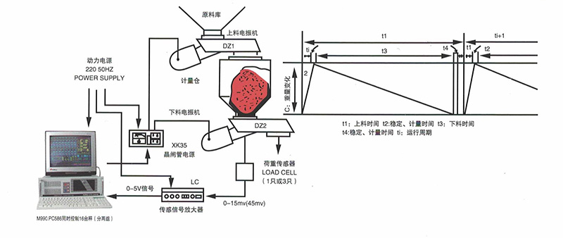 上料電振機(jī)和稱量斗是軟連結(jié)的,重力分離,下料電振機(jī)雖也是軟連結(jié),但其重力和稱量斗整體由三只拉力傳感器支撐的,由稱量斗內(nèi)料柱連結(jié)。工作時(shí)首先由上料電振機(jī)向稱量斗給料,當(dāng)達(dá)到料倉給定重量的給定上限值時(shí),停止給料。間隔一段時(shí)間后,下料電振機(jī)開始卸料,當(dāng)卸料至給定的重量下限值時(shí),停止卸料;如此重復(fù)動(dòng)作。物料的流量計(jì)量是由料倉內(nèi)失去的物料重量多少來確定,因此叫失重定量給料機(jī)?! ?